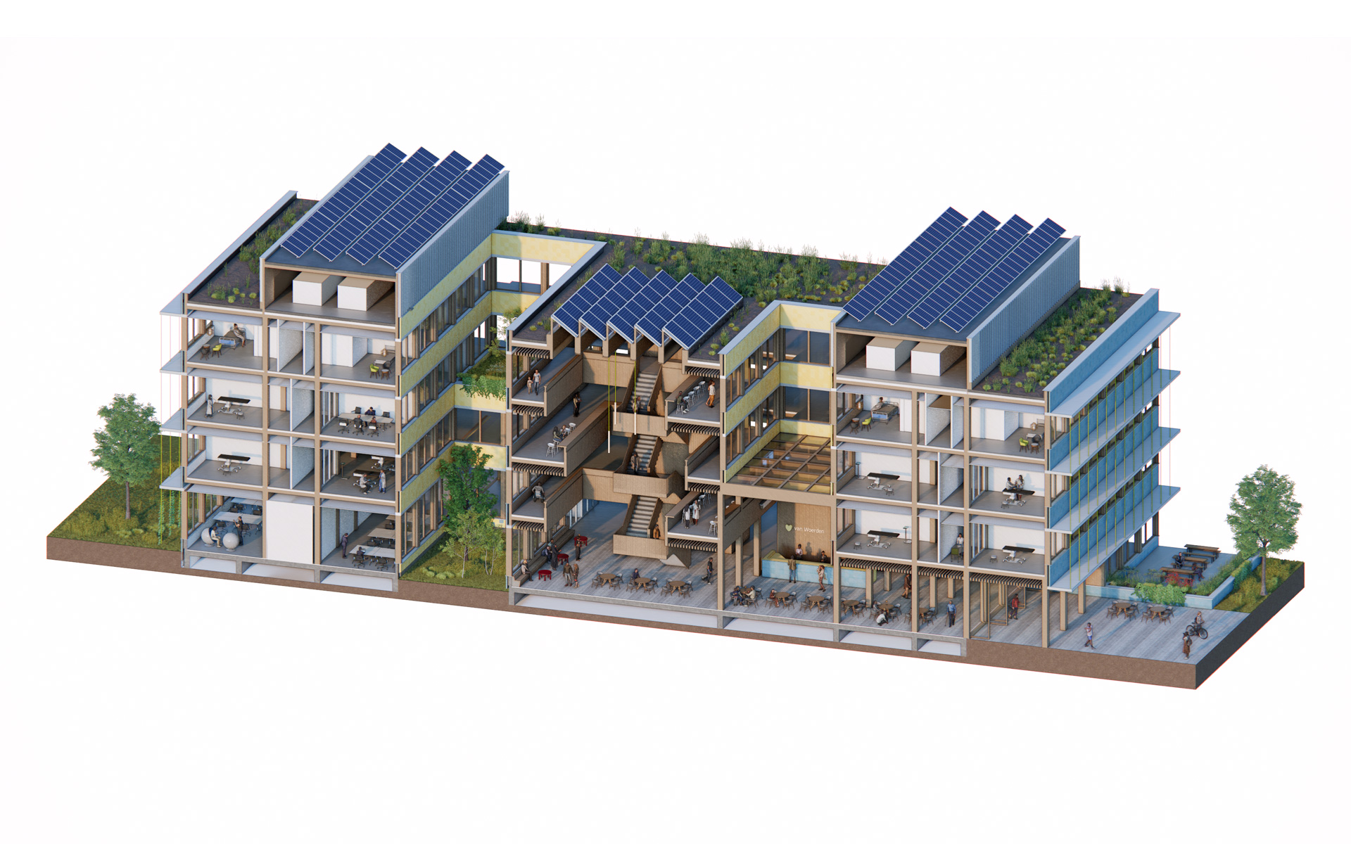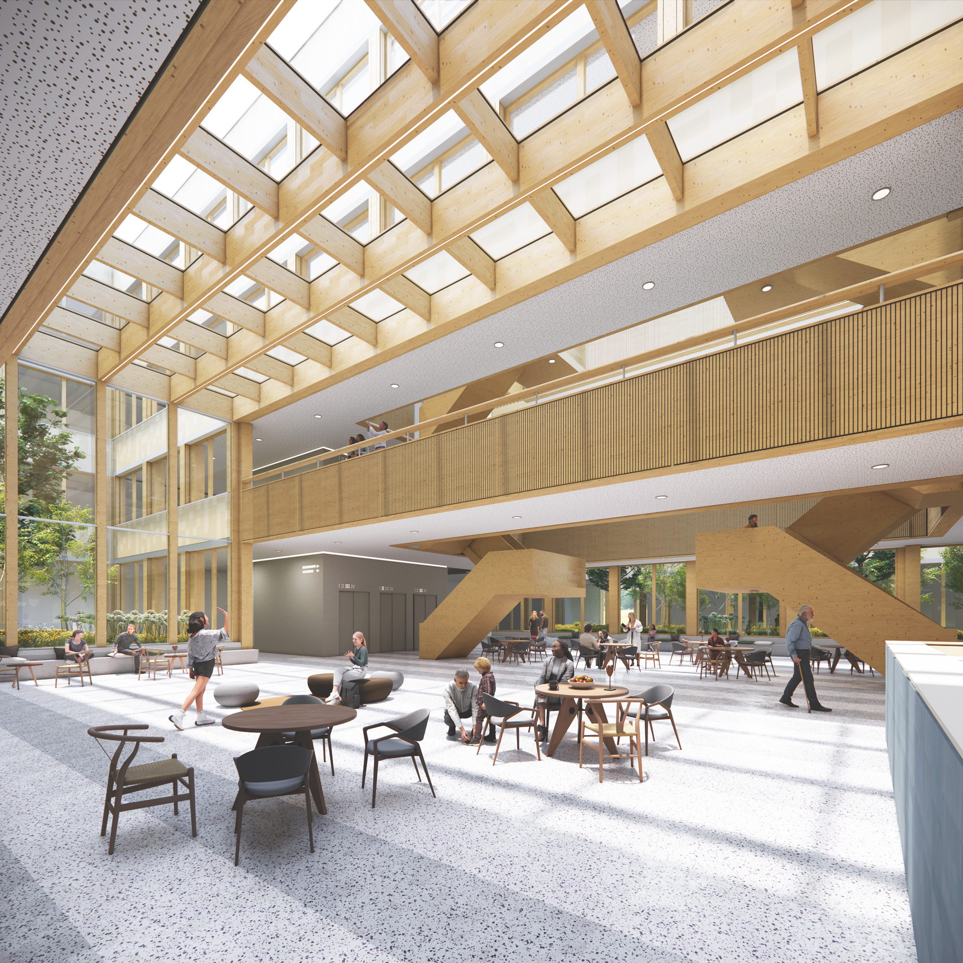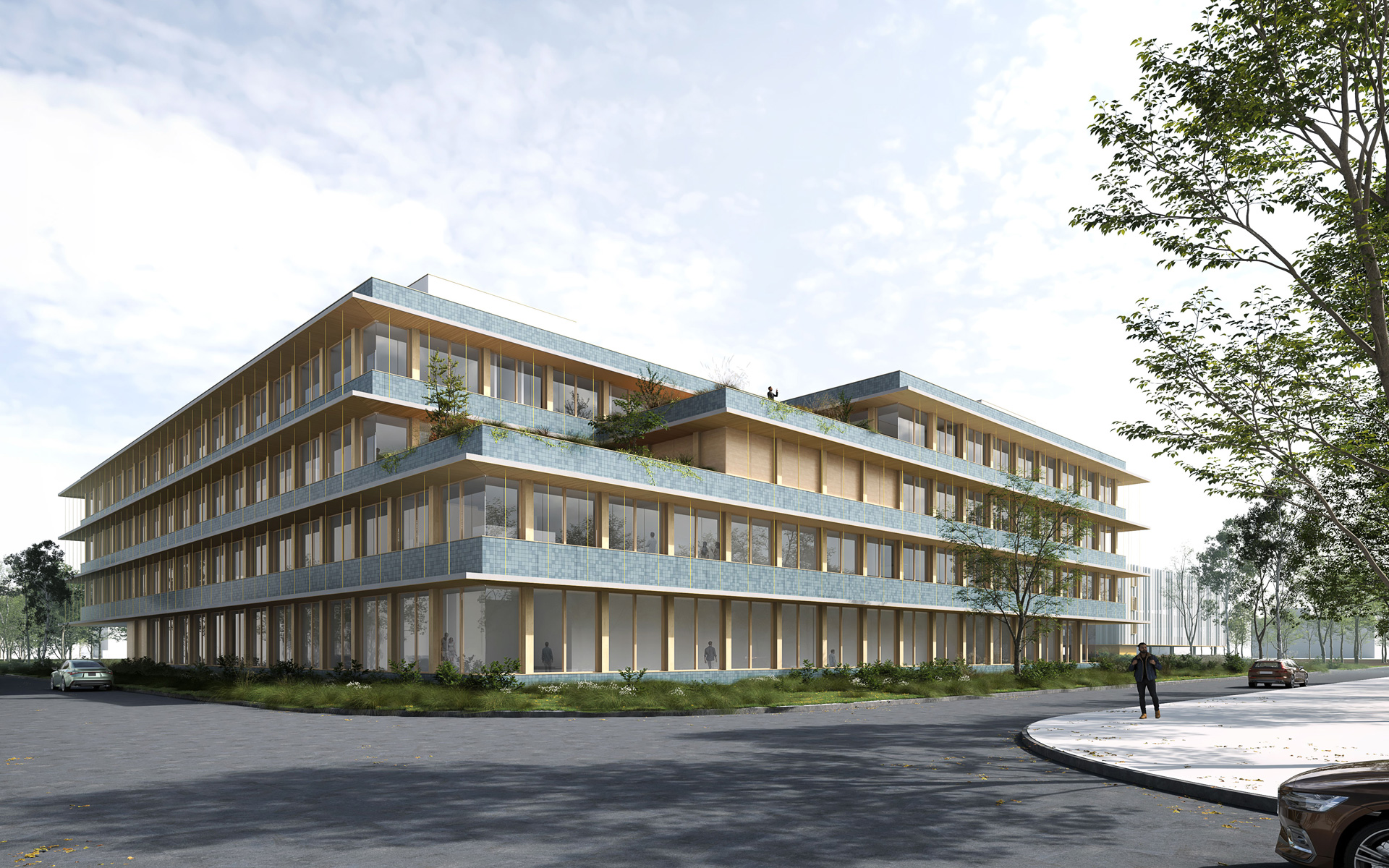 The building’s greatest strength lies in what we call a “flexible canvas”. Each floor forms an identical, refined grid with wooden columns, which allows for flexible scaling up and down of the various functions. In short, breathing space—combined with the use of as many natural materials as possible. This is exactly what this new location needs and offers essential flexibility to its users. Whatever the (future) users want with their spaces—larger, smaller, a different layout—it can be realised.