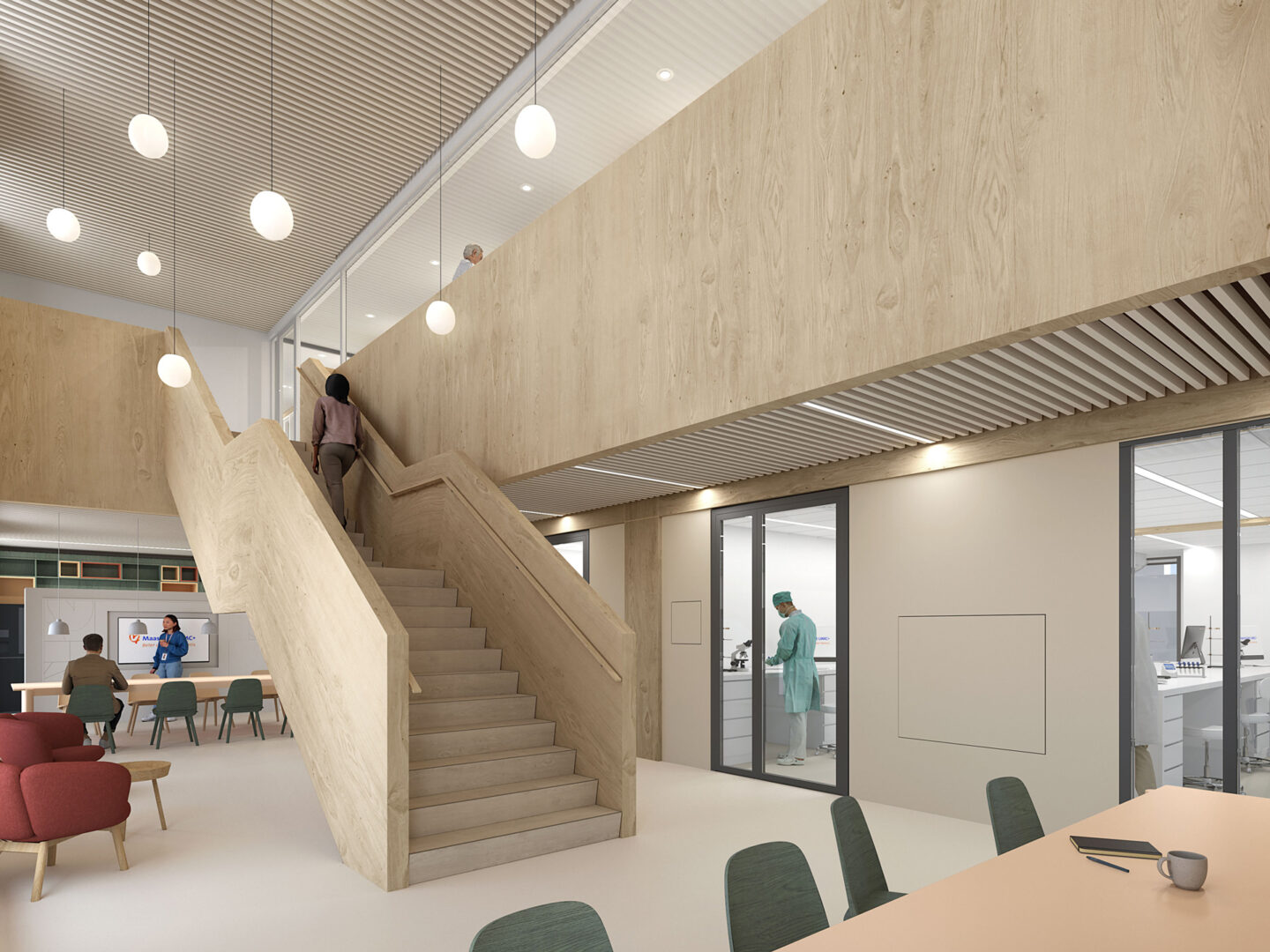 The laboratory technicians and researchers at the Clinical Genetics Laboratory at Maastricht UMC+ are getting a “next level” working environment. A working environment that combines high-quality laboratories, quiet workspaces and natural materials. We established the basic principles early on, together with all users. Intensive work sessions and 3D model studies resulted in a shared vision of a place that connects people, processes and disciplines.